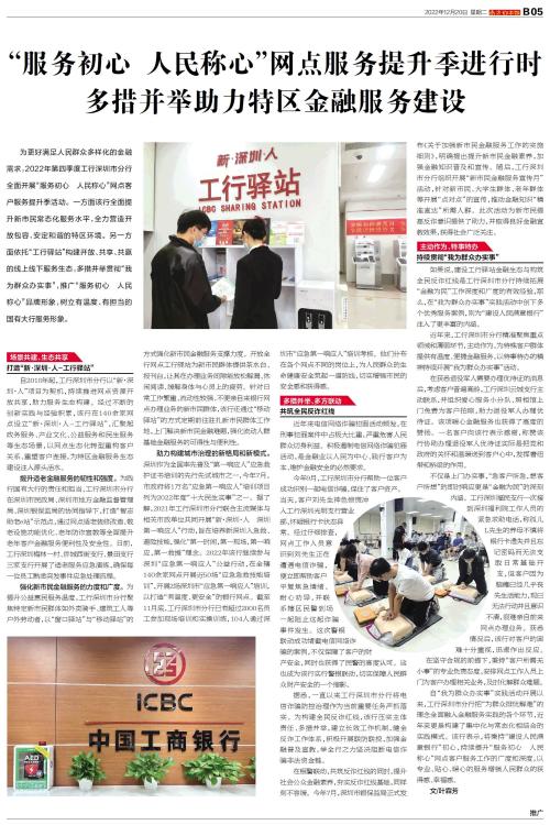 为更好满足人民群众多样化的金融需求,2022年第四季度工行深圳市分行全面开展“服务初心 人民称心”网点客户服务提升季活动。一方面该行全面提升新市民常态化服务水平,全力营造开放包容、安定和谐的特区环