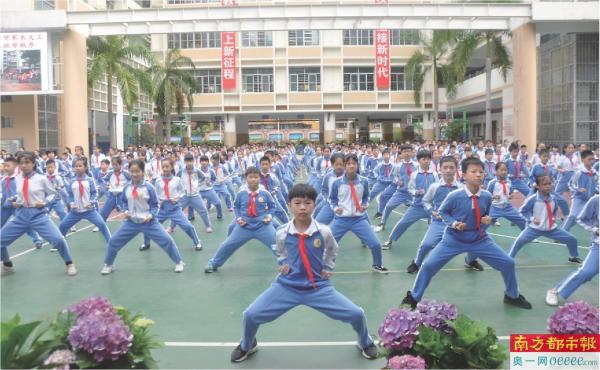 少年强则国强。在人民小学,早操时段每位学生都习练武术操3次,熟练地掌握基本动作,实现参与率高达100%;学校武术队则在每周一至周五早晚进行训练,掌握中级难度的武术技术动作;每班每周都固定安排一节武术课,各年级的教学内容由浅入深;各大武术社团则每周至少开展3次训练,学生主要练习中级技术动作。体育老师表示传授武术基本动作要领,主要内容包括步法的练习、手法的练习、单个动作的练习、组合动作的练习、整套动作的练习五个方面。通过“少年精武”培养传承百年精武精神、塑造强身健体且坚毅担当的少年,人民小学将中华优秀传统文化代代传承。