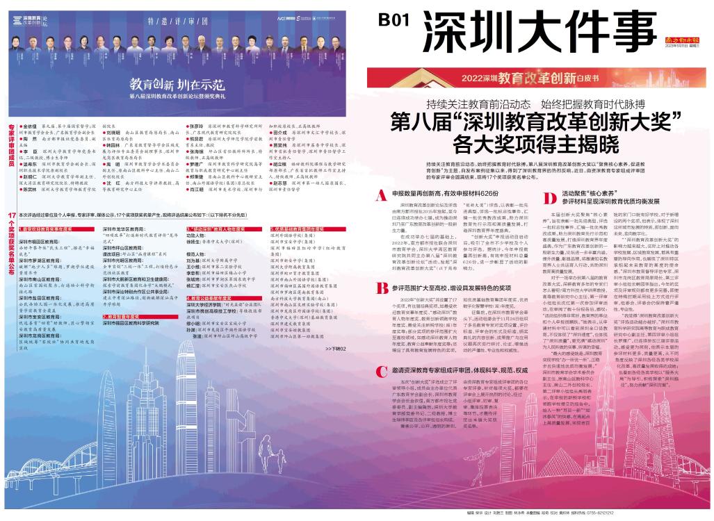 持续关注教育前沿动态,始终把握教育时代脉搏。第八届深圳教育改革创新大奖以“聚焦核心素养,促进教育创新”为主题,自发布案例征集以来,得到了深圳教育界的热烈反响。近日,由资深教育专家组成评审团的专家评