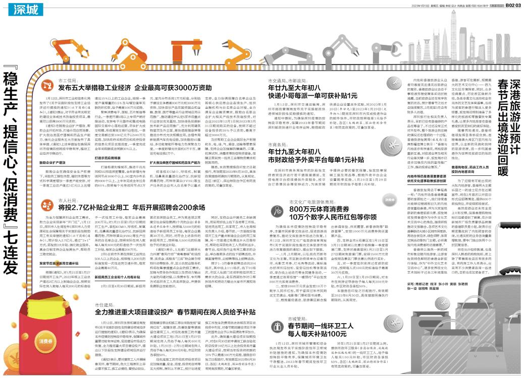 市工信局:发布五大举措稳工业经济 企业最高可获3000万资助 1月12日,深圳市工业和信息化局发布了《关于实施阶段性支持工业经济运行措施的通知》(以下简称《通知》),《通知》提出,对于符合有关规