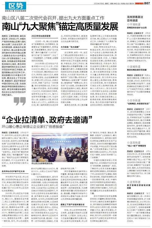 南都讯 记者陈紫嫣 通讯员吴永东 2月6日上午,中国共产党深圳市南山区第八届代表大会第二次会议召开,深圳市委常委、前海合作区党工委书记、南山区委书记曾湃代表中共深圳市南山区第八届委员会向大会作题为