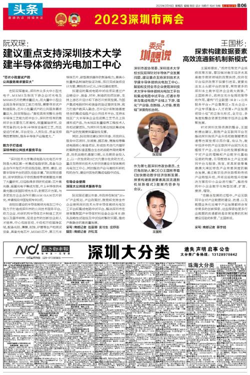 深圳市政协常委、深圳技术大学校长阮双琛针对半导体产业发展问题,建议重点支持深圳技术大学建半导体微纳光电加工中心,鼓励和支持全市企业使用深圳技术大学半导体微纳光电加工平台和集成电路中试平台,打通半导