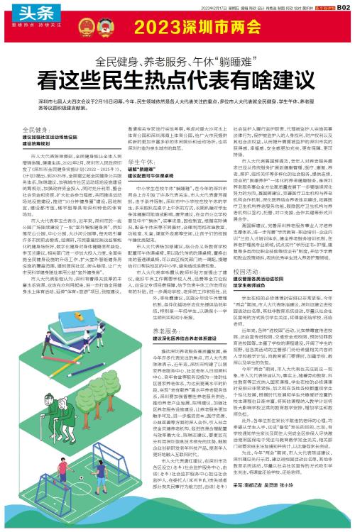深圳市七届人大四次会议于2月16日闭幕。今年,民生领域依然是各人大代表关注的重点,多位市人大代表就全民健身、学生午休、养老服务等议题积极建言献策。 全民健身: 建议加强社区运动场地设施建设统筹