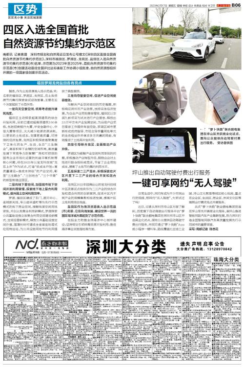 南都讯 记者黄璐 深圳市规划和自然局近日发布公号推文《深圳四区喜提全国首批自然资源节约集约示范区》。深圳市福田区、罗湖区、龙岗区、盐田区入选自然资源节约集约示范县(市)名单,示范期为2023年至2