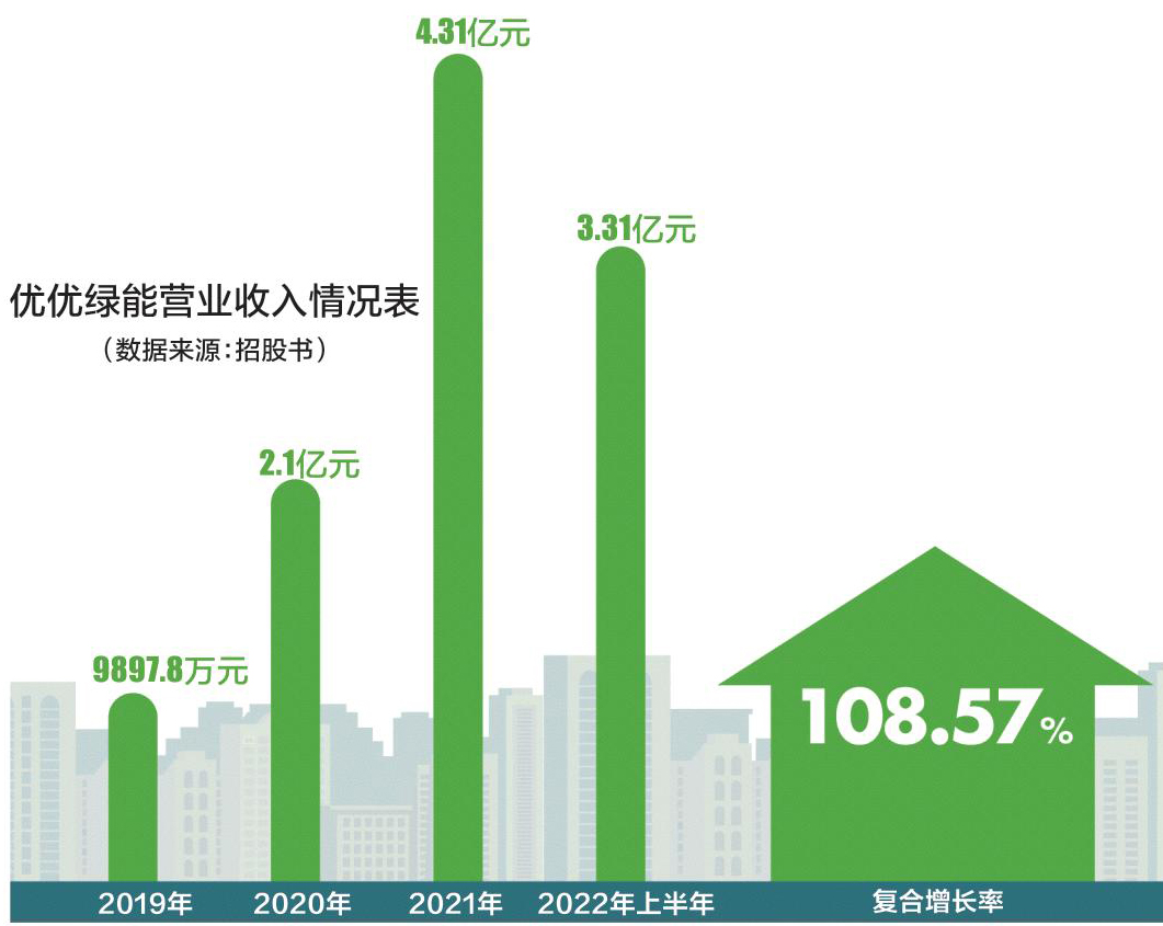 业绩方面,近年来,优优绿能的收入连年攀升。2019-2022年上半年(以下简称“报告期内”),优优绿能分别实现营业收入9897.8万元、2.1亿元、4.31亿元、3.31亿元。2019年至2021年营业收入复合增长率达到108.57%。