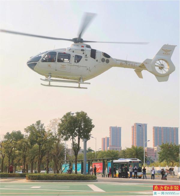 3月2日,坪山区举行直升机空港首飞仪式,标志着从燕子湖会展中心到宝安国际机场、福田大中华的两条固定航线正式开通,这也意味着80km的路程仅需20分钟便可抵达。 南方日报记者 朱洪波 黄诗妤 摄