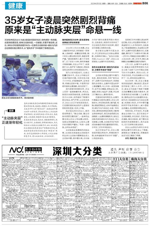 35岁的市民沈女士(化名)前段时间刷手机时,突然感到一阵背痛,去医院检查发现,她有主动脉夹层,一旦破裂,后果不堪设想。近日,深圳大学总医院血管外科为一位急性主动脉夹层+疑似马凡综合征患者实施分期手