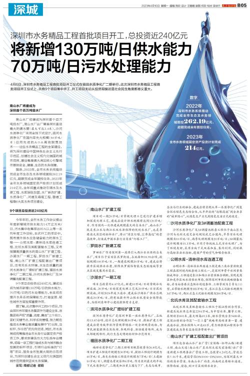 4月6日,深圳市水务精品工程首批项目开工仪式在福田水质净化厂二期举行。此次深圳市水务精品工程首批项目开工仪式上,共有9个项目集中开工,开工项目无论从投资规模还是社会民生角度都意义重大。 南山水厂