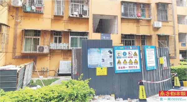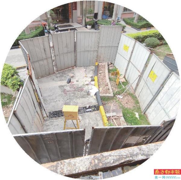 上周,南都记者在福田区市政大院内发现,该小区内住宅楼高均在7层左右,大部分已经完成电梯加装,但住户提及的17栋几个单元均未完成加装。在该栋三单元门口处可见一处预留的电梯井基坑位置,基坑范围有铁皮围挡,并张贴有《燃气管道保护工作要求》《燃气管道保护风险告知》等标识,提示“内有燃气管道”,但基坑仍未开挖。