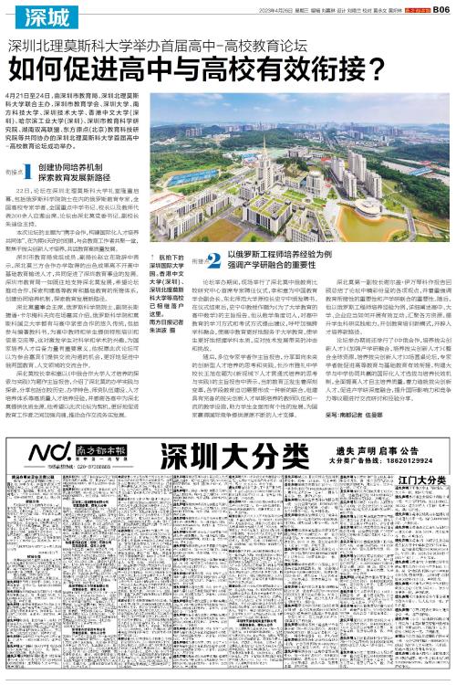 4月21日至24日,由深圳市教育局、深圳北理莫斯科大学联合主办,深圳市教育学会、深圳大学、南方科技大学、深圳技术大学、香港中文大学(深圳)、哈尔滨工业大学(深圳)、深圳市教育科学研究院、湖南双高联