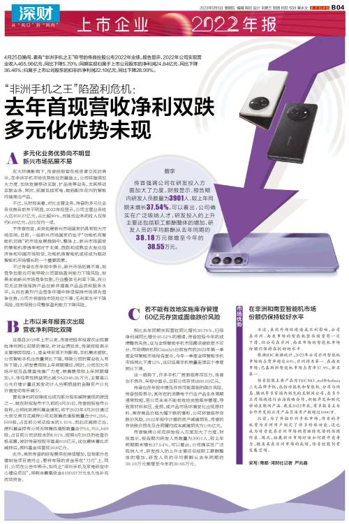 4月25日晚间,素有“非洲手机之王”称号的传音控股公布2022年业绩。报告显示,2022年公司实现营业收入465.96亿元,同比下降5.70%;同期实现归属于上市公司股东的净利润24.84亿元,同