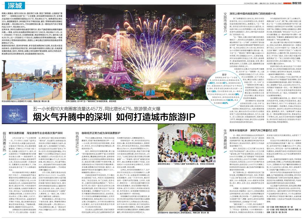 商圈人潮涌动、餐饮大排长龙、酒店预订火爆、景区门票售罄、公园掀起“露营热”……在刚刚过去的“五一”小长假里,深圳消费市场持续火热:全市重点监测的10大商圈客流量高达457万,同比增长47%,销售额同比增长33%。美团数据显示,深圳通过平台下单的住宿、餐饮、零售等消费总规模位居全省第一,同比增长36%。汽车消费持续火爆,五一期间全市汽车订单量约达2.8万个,同比增长30%。