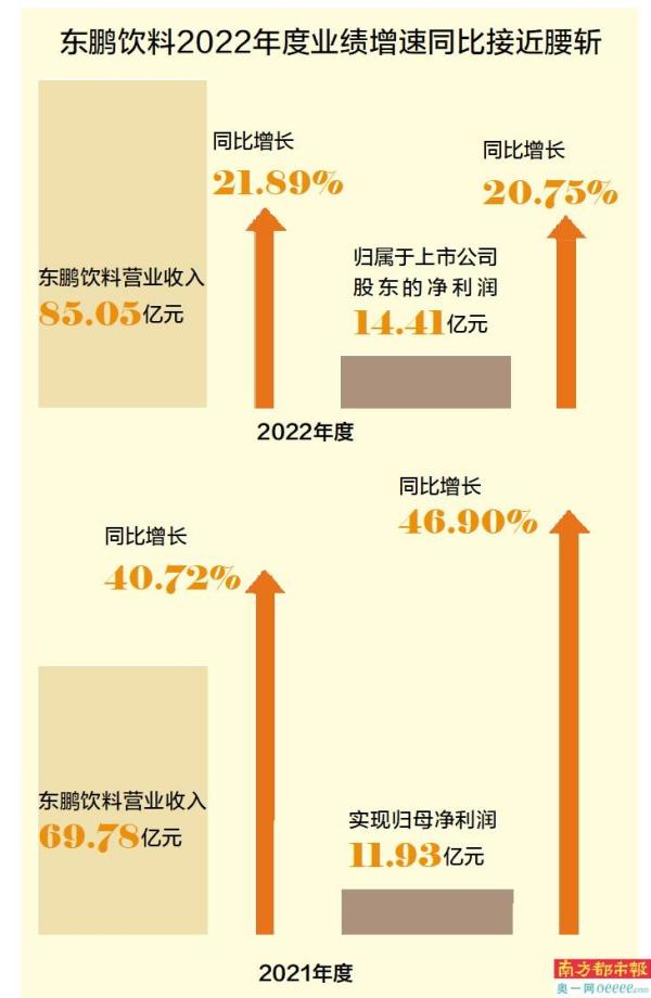 报告期内,2022年东鹏饮料营业收入为85.05亿元,同比增长21.89%;归属于上市公司股东的净利润14.41亿元,同比增长20.75%。