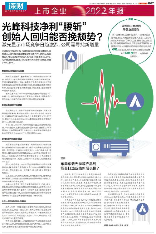 光峰科技净利“腰斩”创始人回归能否挽颓势?