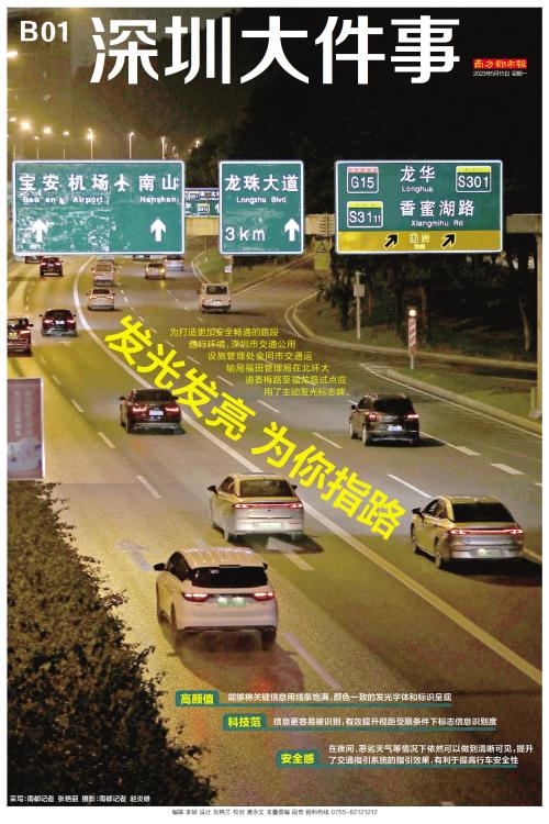为打造更加安全畅通的路段通行环境,深圳市交通公用设施管理处会同市交通运输局福田管理局在北环大道香梅路至福龙路试点应用了主动发光标志牌。 高颜值 能够将关键信息用线条饱满、颜色一致的发光字体和标