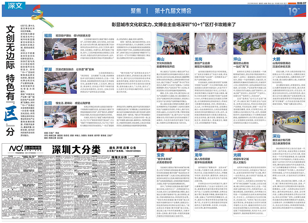 6月7日,第十九届文博会在深圳拉开帷幕。 深圳致力建设区域文化中心城市和彰显国家文化软实力的现代文明之城,使命由各区共担。 深圳正不断激发全社会文化创新创造活力,加快打造与先行示范区相匹配的城