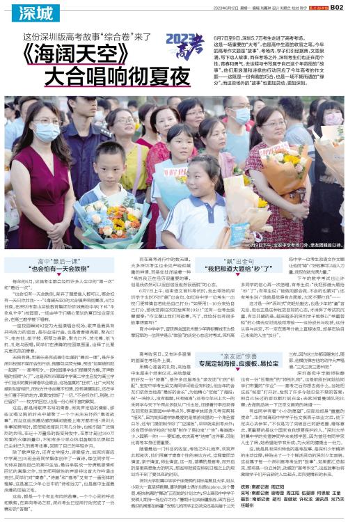 6月7日至9日,深圳5.7万考生走进了高考考场。 这是一场重要的“大考”,也是高中生涯的收官之笔。今年的高考作文题是“故事”,考场内,学子们引经据典,文思泉涌,写下动人故事,而在考场之外,深圳考