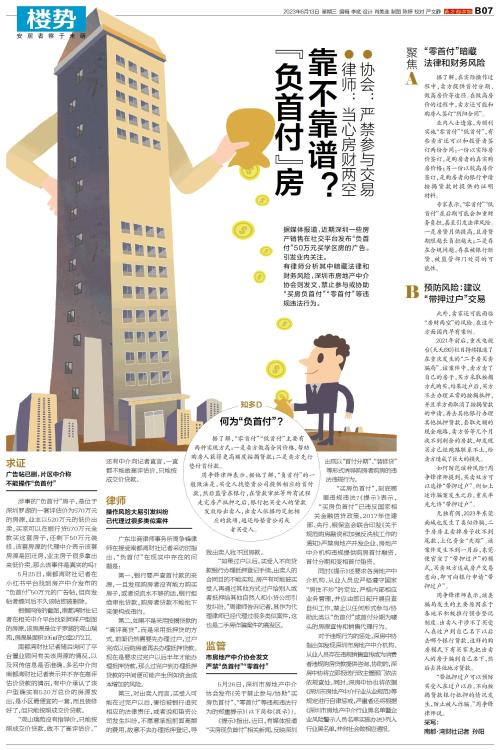 据媒体报道,近期深圳一些房产销售在社交平台发布“负首付”50万元买学区房的广告。引发业内关注。 有律师分析其中暗藏法律和财务风险,深圳市房地产中介协会则发文,禁止参与或协助“买房负首付”“零首付