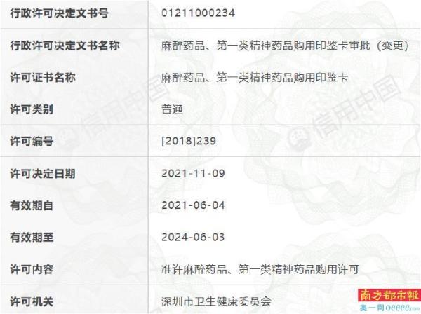 记者通过信用中国平台查询其公开信息发现,深圳伊然美医疗美容诊所所公开的行政许可信息中,并无麻醉印鉴卡信息。从现有公开信息来看,深圳伊然美医疗美容诊所并不具备购买麻醉药品所必需的麻醉印鉴卡,那其所宣称的全麻手术所使用的麻醉药品从何而来?