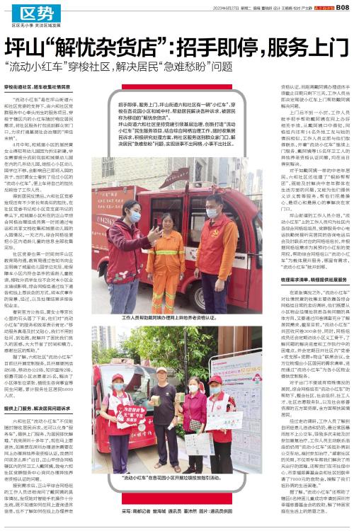 招手即停,服务上门,坪山街道六和社区有一辆“小红车”,穿梭在各花园小区和城中村,帮助居民解决各种诉求,被居民称为移动的“解忧杂货店”。 坪山街道六和社区坚持党建引领基层治理,创新打造“流动小红车