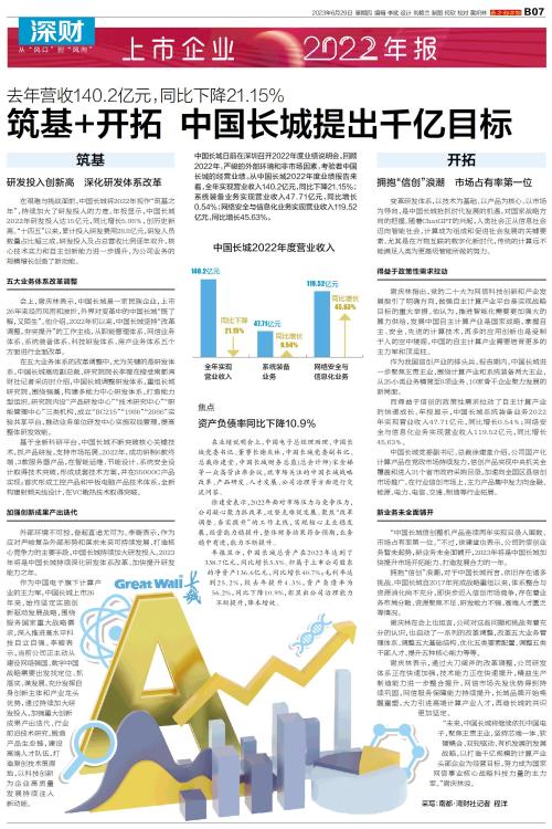 中国长城日前在深圳召开2022年度业绩说明会。回顾2022年,严峻的外部环境和非市场因素,考验着中国长城的经营业绩。从中国长城2022年度业绩报告来看,全年实现营业收入140.2亿元,同比下降21