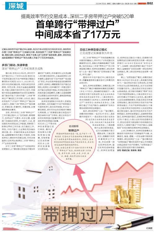 记者从深圳市不动产登记中心获悉,自2021年4月至2023年6月30日,深圳市共办理二手房“带押过户”已突破520单,有效发挥了二手房“带押过户”的制度价值,降低当事人的经济成本,降低了当事人的“