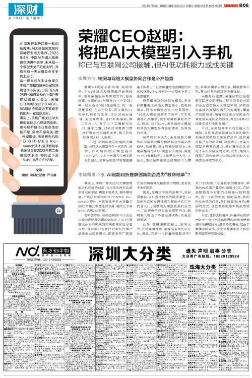 荣耀CEO赵明:将把AI大模型引入手机