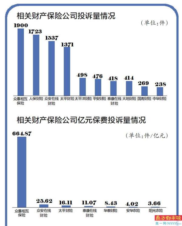 通报显示,从财产保险公司的投诉量情况来看,一季度众惠相互保险的投诉量最多,达1900件,占财产保险公司投诉总量的16.7%;其次是人保财险1723件,占15.1%;众安在线财险1537件,占13.5%;太平财险1371件,占12.0%。随后还有太平洋财险(498件)、平安财险(476件)、泰康在线财险(418件)、大地财险(414件)、国寿财险(269件)等,其中不乏国企和大型企业。