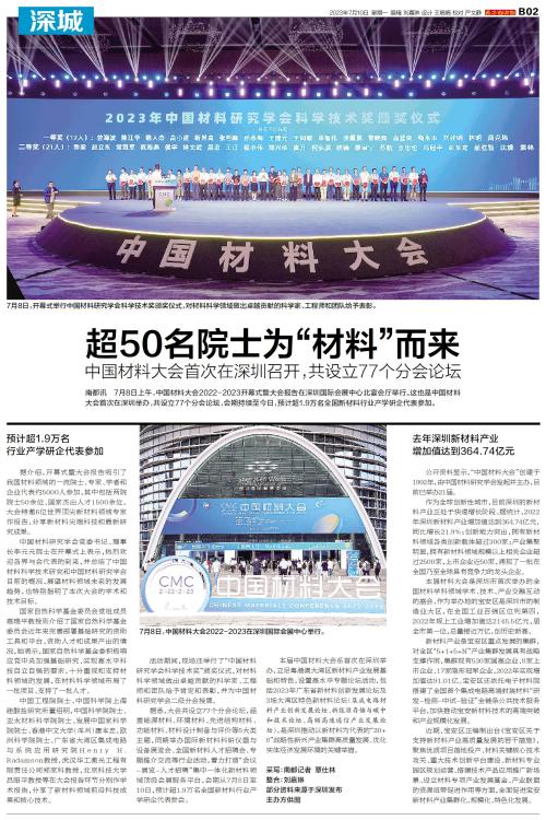 南都讯 7月8日上午,中国材料大会2022-2023开幕式暨大会报告在深圳国际会展中心北宴会厅举行。这也是中国材料大会首次在深圳举办,共设立77个分会论坛,会期持续至今日,预计超1.9万名全国新材