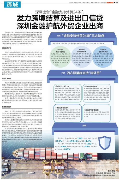 7月6日,中国人民银行深圳市中心支行、国家外汇管理局深圳市分局联合深圳市商务局、中国银行保险监督管理委员会深圳监管局、深圳市地方金融监督管理局等五部门印发《深圳金融支持外贸稳规