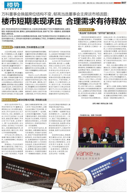 近日,万科在深圳召开2022年度股东大会,大会审议并表决通过了2022年度董事会报告、监事会报告、年度利润分配方案、董事会、监事会换届等多项议案,选举产生了新一届董事会,郁亮等董事候选人高票当选。