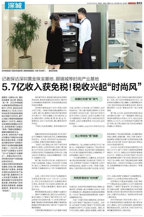 南都讯 记者张小玲 通讯员林建荣 张心雨 明铄岚 陈一萍 2022年帮助周大福享受研发费用加计扣除47.2万元,免征企业所得税收入5.7亿元;2022年玛丝菲尔享受研发费用加计扣除2138万元,旗