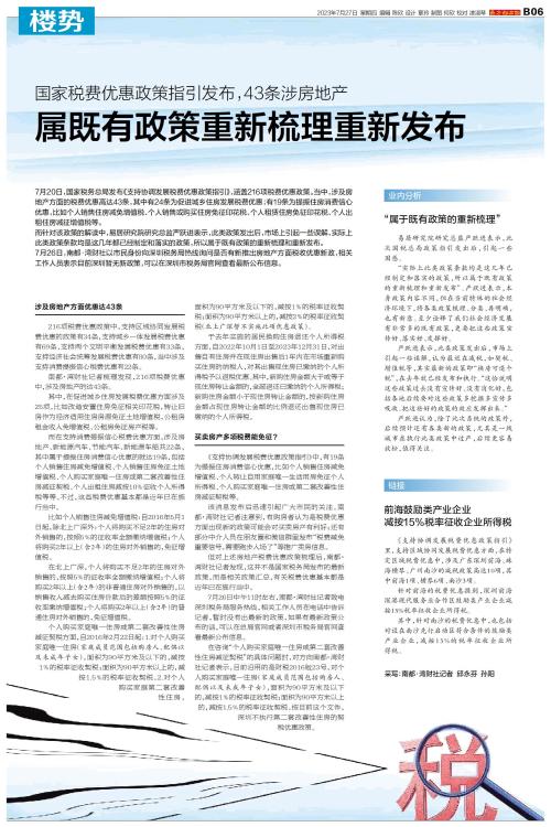 7月20日,国家税务总局发布《支持协调发展税费优惠政策指引》,涵盖216项税费优惠政策。当中,涉及房地产方面的税费优惠高达43条,其中有24条为促进城乡住房发展税费优惠;有19条为提振住房消费信心