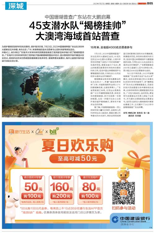 为保护珊瑚资源多样性和完整性、保护海洋环境,7月23日,2023中国珊瑚普查广东站在深圳市大鹏新区拉开序幕,来自北京、广州、珠海等地的潜水志愿者与公民科学家等参加活动。 开幕式上,举办单位广东海