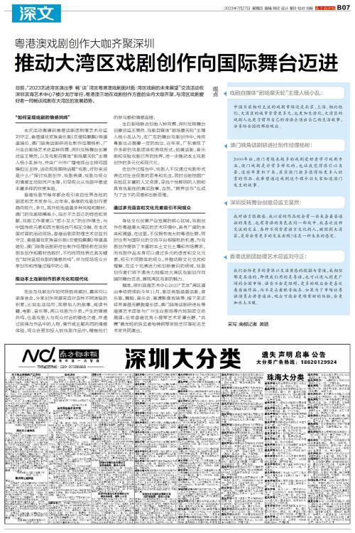 日前,“2023艺述湾区演出季 畅‘谈’湾区粤港澳戏剧面对面:湾区戏剧的未来展望”交流活动在深圳滨海艺术中心7楼沙龙厅举行。粤港澳三地在戏剧创作方面的业内大咖齐聚,与湾区戏剧爱好者一同畅谈戏剧在大