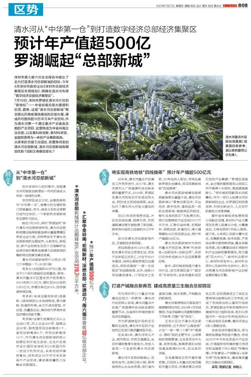 清水河总部新城预计远期释放产业空间279.7万平方米。 汇聚中金岭南、宏翔新材、深燃总部、软通动力、周六福等营收10亿级总部企业。 预计年产值超500亿元。 深圳市委七届六次全会报告中提出了