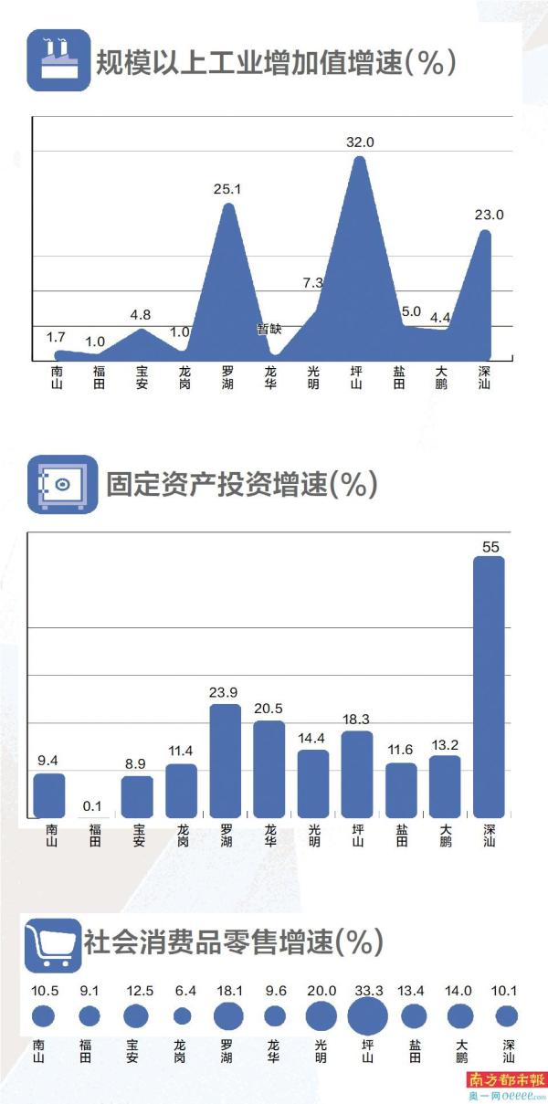 从深圳“10+1”区上半年GDP增速来看,前三位依次为深汕特别合作区32.3%、坪山区22.3%、宝安区10.5%。其中,宝安区为经济大区,上半年交出10.5%的GDP增速,尤为难得。坪山区GDP总量在全市居于第八的位置,上半年GDP增速高达22.3%,表现亮眼。