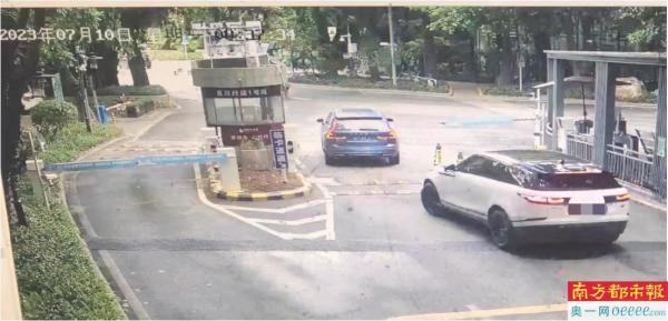 7月10日,龙华区星河丹堤小区出入口监控画面。白色小车(肇事车)离开小区。 视频截图