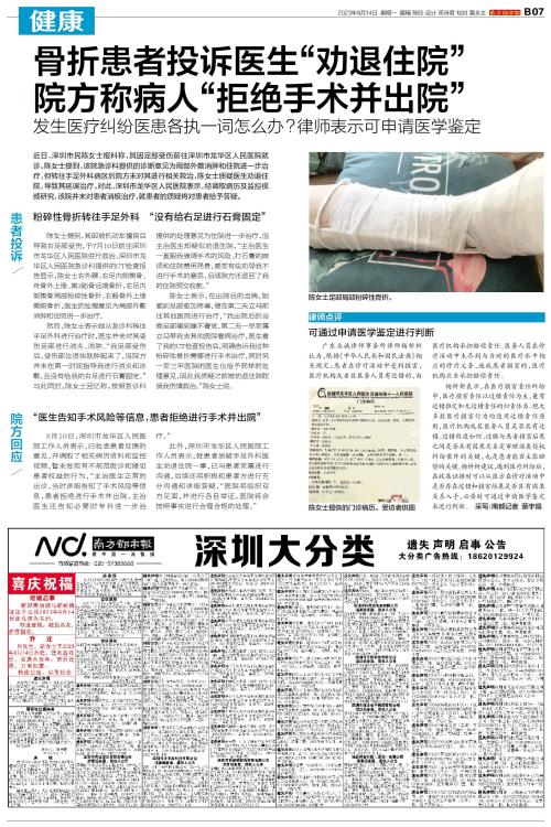 骨折患者投诉医生“劝退住院” 院方称病人“拒绝手术并出院”