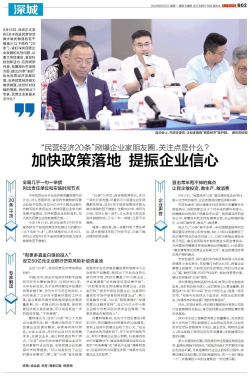 8月16日,深圳正式发布《关于促进民营经济做大做优做强的若干措施》(以下简称“20条”),紧盯深圳民营企业发展的共性问题,从重大项目建设、激发科技创新活力、应用场景开放、拓展海外市场等方面,提出2
