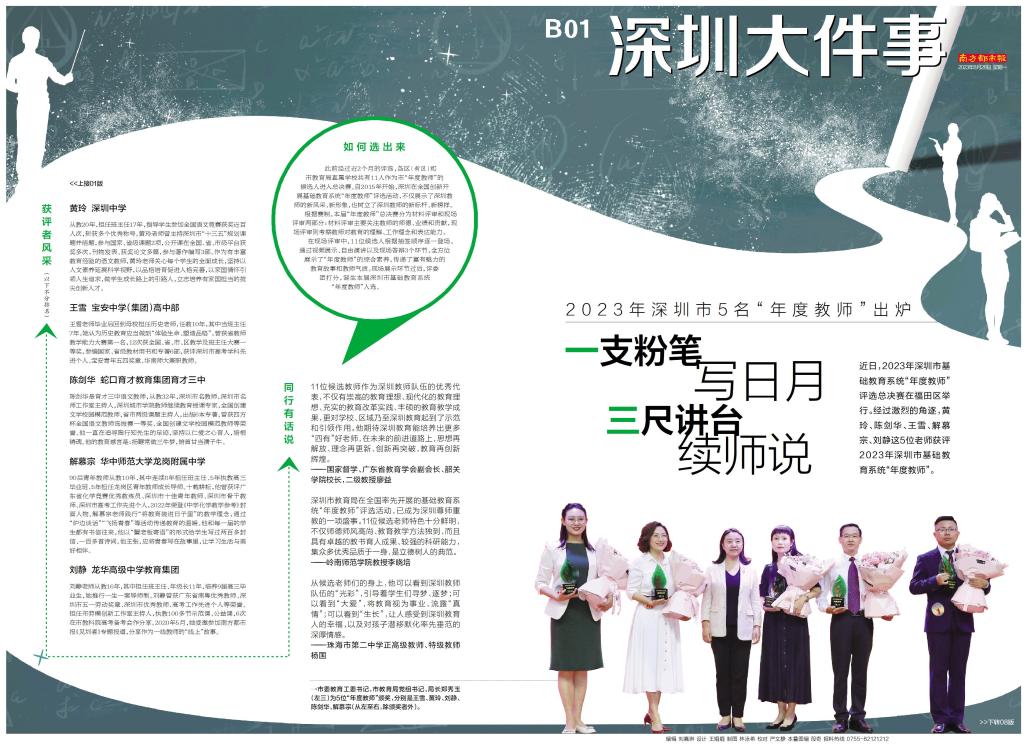 近日,2023年深圳市基础教育系统“年度教师”评选总决赛在福田区举行。经过激烈的角逐,黄玲、陈剑华、王雪、解慕宗、刘静这5位老师获评2023年深圳市基础教育系统“年度教师”。 获评者风采(以下不