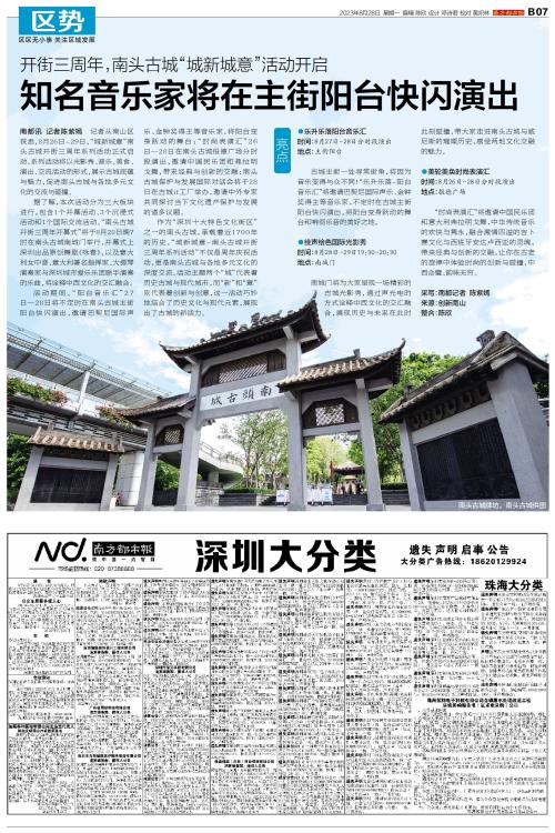 南都讯 记者陈紫嫣 记者从南山区获悉,8月26日-29日,“城新城意”南头古城开街三周年系列活动正式启动。系列活动将以光影秀、音乐、美食、演出、交流活动的形式,展示古城底蕴与魅力,促进南头古城与各