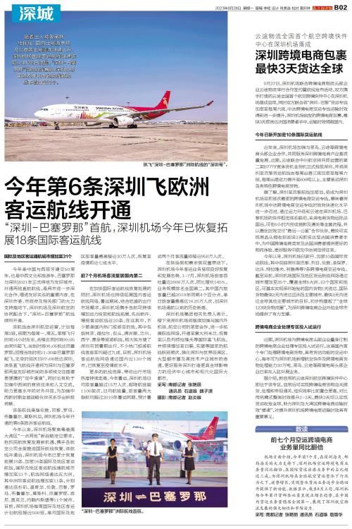 8月27日,深圳机场联合跨境电商物流头部企业云途物流举行合作签约暨航线发布活动,双方携手打造的云途全国首个航空跨境快件中心在深圳机场落成启用,同时双方联合将“深圳-巴黎”货运专线加密至每周六班,中