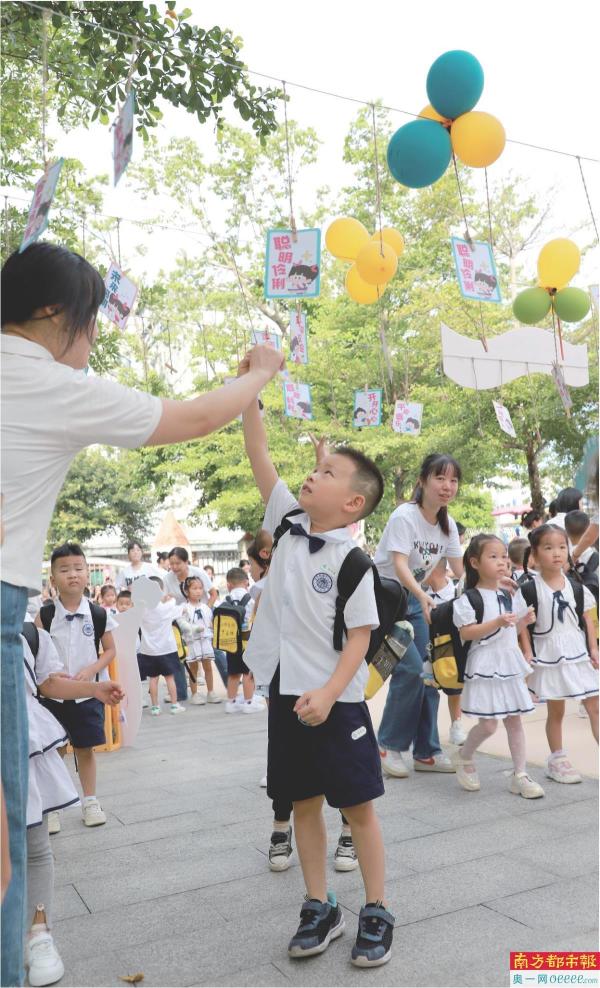 9月4日8时许,下沙小学门口喜气洋洋。有些来得早的同学,已经拿到了第一份“礼物”——学校精心定制制作的“种子纸”。新生入学仪式以“生长吧,红树苗”为主题,校门口设置了3个环节(红树苗成长养分大转盘、红树苗成长节节高、红树苗新学期寄语树),为新学年学子带来美好的寓意和祝福。