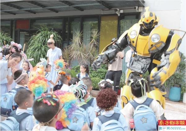 深圳市南山区纯水岸幼儿园为孩子们准备了“我的新发型”“我的新发现”“大家一起发动”3个系列小活动迎接新学期。其中在“大家一起发动”活动中,传统文化创编“三彩闹千灯”开始了,随后“引燃”老师们的舞蹈《一触即发》。新的学期,机器人“大黄蜂”和“小姜”来到纯水岸幼儿园,让孩子们感受科技与艺术的碰撞。