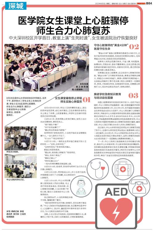 8月28日是中山大学深圳校区开学首日。当天下午,医学院大二学生正在上生物化学课,学生小玉(化名)突然心脏骤停,师生合力心肺复苏,随后小玉被送到中山七院继续救治,目前恢复良好。 01 女生课堂晕