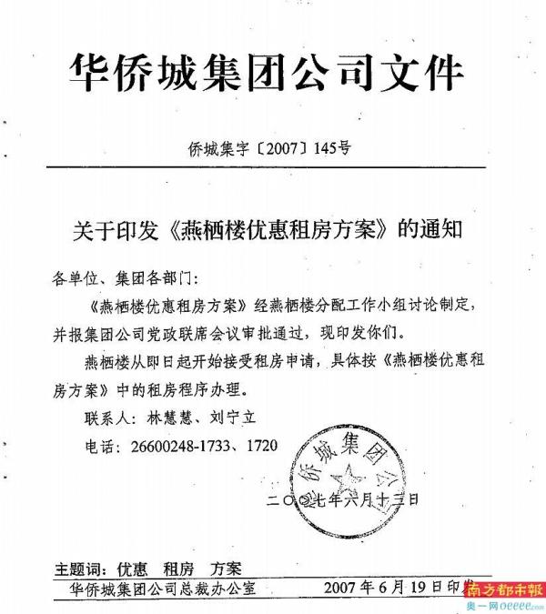 2007年6月,华侨城集团公司印发的《燕栖楼优惠租房方案》。