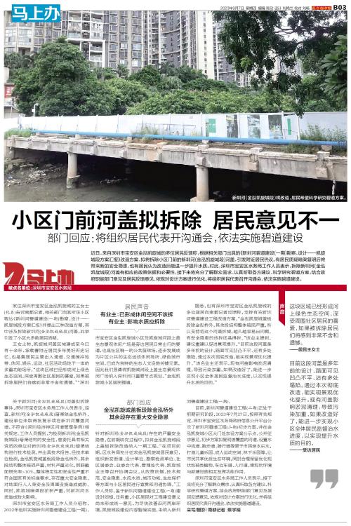 被点名单位:深圳市宝安区水务局 近日,来自深圳市宝安区金泓凯旋城的多位居民反馈称,根据相关部门出具的《新圳河碧道建设(一期)勘察、设计——凯旋城段方案汇报》改造方案,拟将拆除小区门前的新圳河(