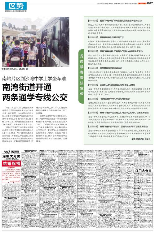 9月11日上午,由龙岗区南湾街道荔枝花园总站开往厦村站(沙湾中学)的定制巴士3684号启动试运行。此举将切实解决“南岭片区到沙湾中学学生上学难”的问题。据了解,开学以来,南湾街道已开通多条“通学专