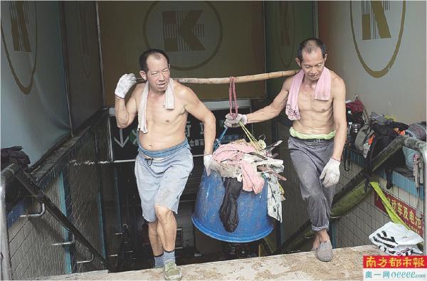 工人搬货 9月16日,罗湖东门,工人正在清理老街地铁站地下商场内的泡水物品。